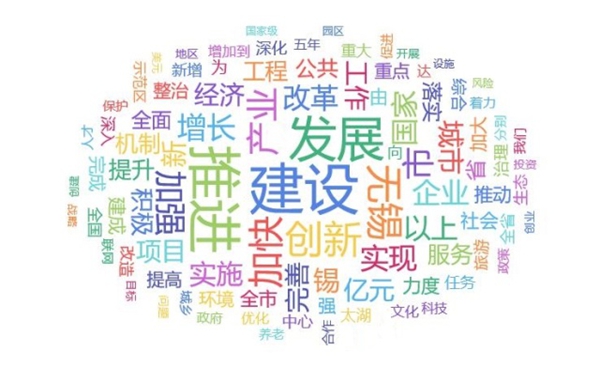 我們通過分析《政府工作報告》全篇的23397字,生成了詳細的關鍵詞統計表。在受監測的151組關鍵詞中,詞頻最高的是“建設”(122次),最低的“削減”出現了6次。在剔除“無錫”“城市”“經濟”等詞組后,詞頻和權重最高的十個關鍵詞分別是:建設、產業(產業強市)、創新、改革、增長、研發、環境、技術、工程、公共。