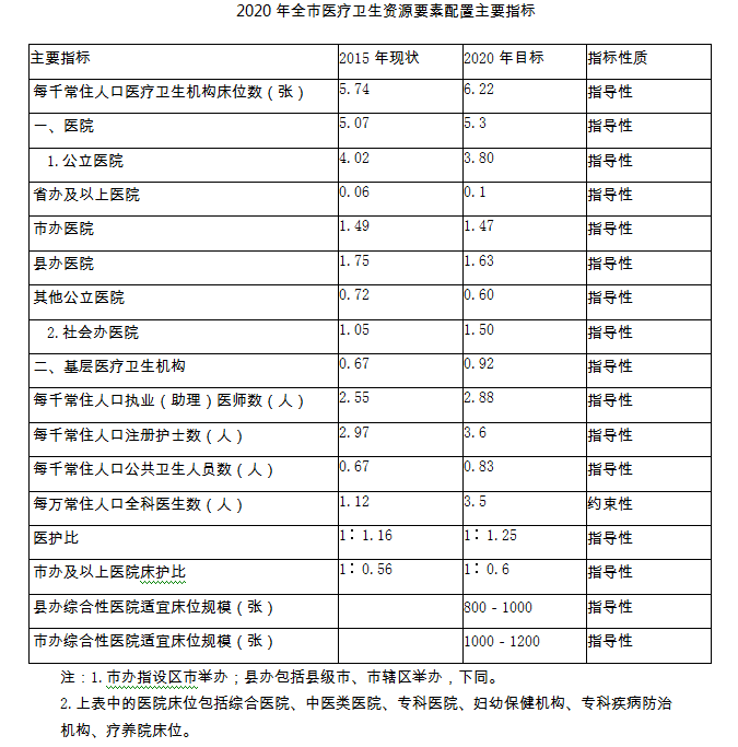 到 2020 年,全市每千常住人口醫(yī)療衛(wèi)生機(jī)構(gòu)床位數(shù)6.22 張以上,其中醫(yī)院5.3張,基層醫(yī)療衛(wèi)生機(jī)構(gòu)0.92張。中醫(yī)類醫(yī)院床位可以按照每千常住人口0.75張配置。同時(shí),可以按照15%的公立醫(yī)院床位比例設(shè)置公立專科醫(yī)院,優(yōu)先支持兒童、精神、婦產(chǎn)、康復(fù)等專科發(fā)展。