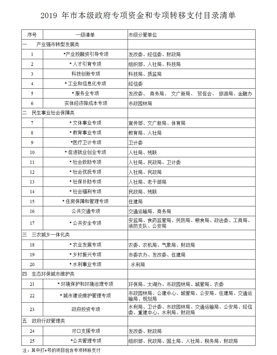2019年市本級政府專項資金和專項轉移支付目錄清單