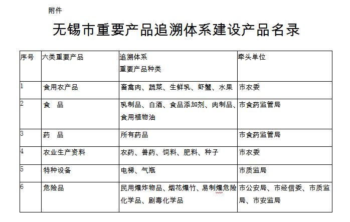 無錫市重要產品追溯體系建設工作實施方案