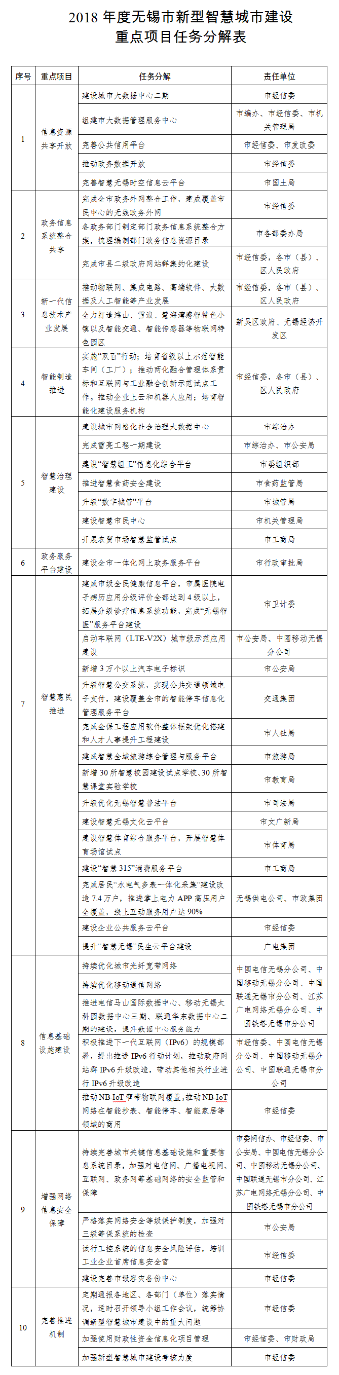 附件:2018年度無錫市新型智慧城市建設重點項目任務分解表