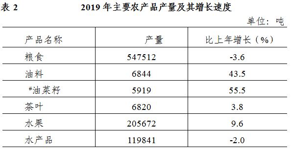 全年糧食總產(chǎn)量54.75萬噸,比上年下降3.6%。預(yù)計(jì)油料總產(chǎn)量6844噸,比上年增長43.5 %,其中油菜籽5919噸,比上年增長55.5%;茶葉總產(chǎn)量6820噸,比上年增長3.8 %;水果總產(chǎn)量20.57萬噸,比上年增長9.6%。