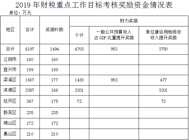 根據以上情況,給予各地區2019年財稅重點工作目標考核獎勵補助資金,總計6197萬元(具體詳見附件)。