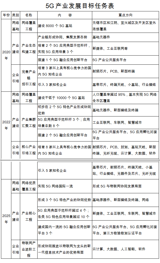 1.優化布局,統籌規劃空間協調發展新格局。培育5G產業集群。以新吳區、濱湖區及經濟開發區為核心,其他區市協同聯動,構建產、學、研、用完整生態體系,加快形成我市5G產業和應用規模發展新格局。基于各市(縣)、區現有產業優勢,明確5G基礎元器件、5G新型模組及終端、5G網絡等3個主要產業發展方向,圍繞關鍵領域重點突破,逐步形成協同優勢。江陰市重點提升光纖光纜的產業水平,宜興市重點推進5G天線的產業發展,梁溪區重點構建5G應用的示范樣板,錫山區重點增強PCB的產業實力,惠山區重點打造5G新型終端的產業基地,濱湖區重點推進5G射頻芯片產業基地建設及5G網絡的創新升級,新吳區重點推動5G新型模組及光模塊的產業發展,經開區重點提升5G相關產業的科研實力及5G射頻濾波器的產業水平。
