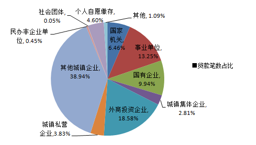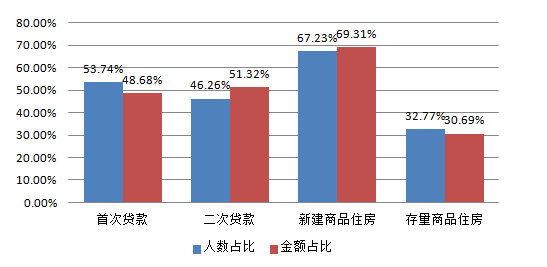 從貸款群體來看,剛需與改善型住房需求職工分別占貸款總人數的24.41%和51.23%。從單位性質來看,以其他城鎮企業職工為主,貸款筆數和貸款金額占比分別為38.94%、37.14%。從購房面積來看,職工貸款購買小于90㎡、90-120㎡房屋居多,分別占貸款總人數的24.41%、28.33%。從主借人繳存基數來看,貸款主要以中、低收入職工為主,分別占貸款總人數的41.4%、55.81%。從貸款類型來看,純公積金貸款和組合貸款占比分別為51.94%、48.06%。從貸款結構來看,首次公積金貸款職工占貸款總人數的53.74%,第二次住房公積金貸款人數僅占46.26%,說明我市住房公積金貸款政策在保障剛需職工需求,體現住房公積金互助性方面發揮了較大的作用,住房公積金制度的初衷未改變。具體放貸結構如下: