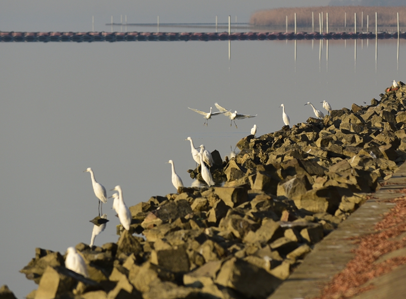 1月14日,鷺鳥(niǎo)在太湖新城太湖飛舞嬉戲。 寒冬時(shí)節(jié),成群鷺鳥(niǎo)棲息在無(wú)錫太湖邊,成為一道靚麗的風(fēng)景。