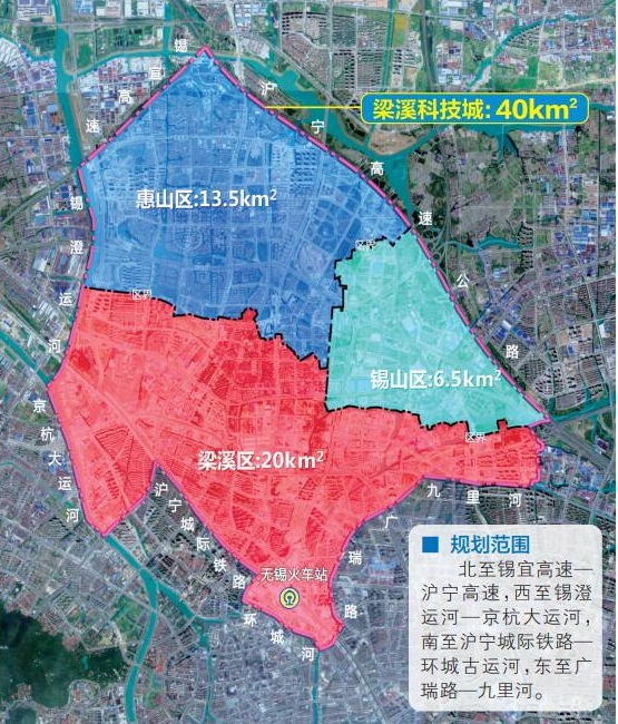 梁溪科技城規劃編制范圍位于老城區北部的三區交界之地,北至錫宜高速—滬寧高速,西至錫澄運河—京杭大運河,南至滬寧城際鐵路—環城古運河,東至廣瑞路—九里河,總面積約40平方公里。其中,梁溪區20平方公里,惠山區13.5平方公里,錫山區6.5平方公里。此次招標的內容,不僅包括梁溪科技城概念規劃,還包括對10平方公里核心區開展概念性城市設計,并在核心區范圍內選取1—2平方公里區域作為科技城核心啟動區,開展詳細城市設計。