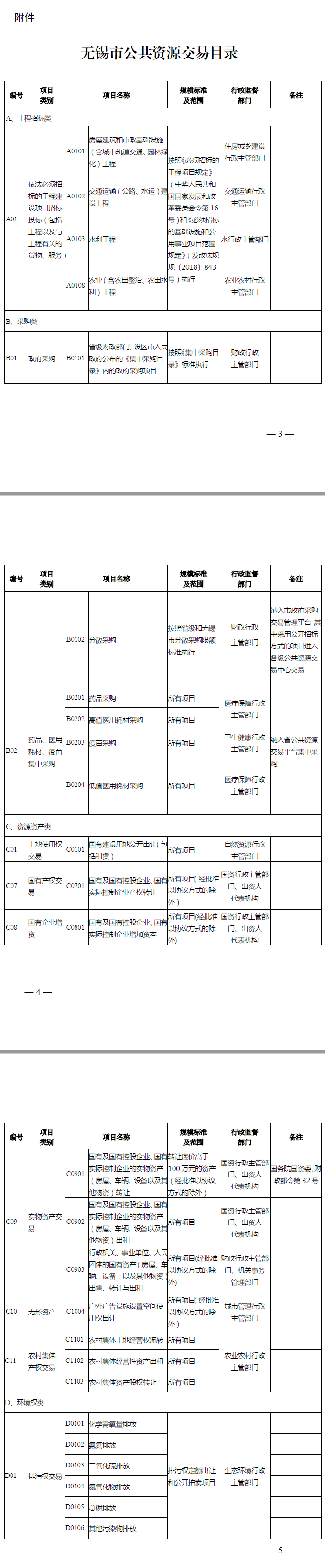四、本《目錄》自發(fā)布之日起執(zhí)行,《市政府辦公室關(guān)于印發(fā)〈無錫市公共資源交易目錄〉的通知》(錫政辦發(fā)〔 2017〕80號)同時廢止。