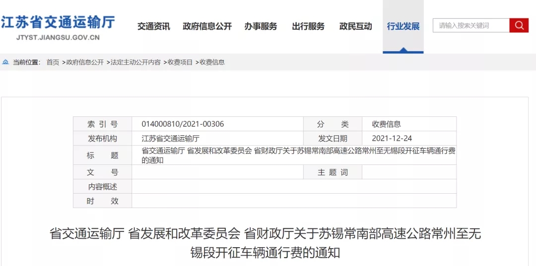 省交通運輸廳 省發展和改革委員會 省財政廳關于蘇錫常南部高速公路常州至無錫段開征車輛通行費的通知
