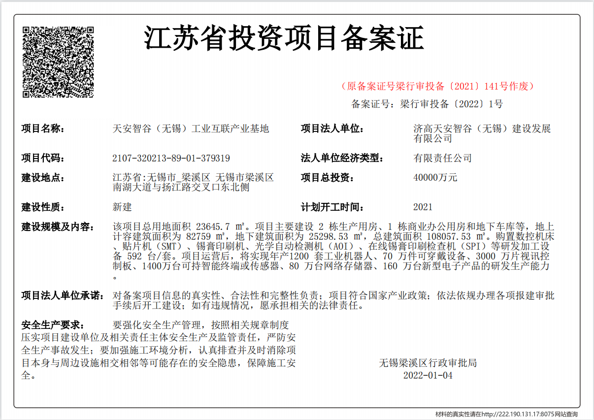 天安智谷(無(wú)錫)工業(yè)互聯(lián)產(chǎn)業(yè)基地項(xiàng)目于2022年1月4日辦結(jié)江蘇省投資項(xiàng)目備案證,備案證號(hào):梁行審?fù)秱洹?022】1號(hào),項(xiàng)目代碼2107-320213-89-01-379319。