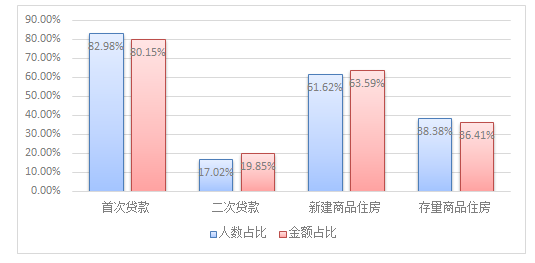 從貸款群體來看,剛需與改善型住房需求職工分別占貸款總人數(shù)的29.27%和64.38%。從單位性質來看,以城鎮(zhèn)私營企業(yè)及其他城鎮(zhèn)企業(yè)職工為主,貸款筆數(shù)和貸款金額占比分別為50.26%、49.54%。從購房面積來看,職工貸款購買小于90㎡、90-120㎡房屋居多,分別占貸款總人數(shù)的29.27%、38.36%。從主借人繳存基數(shù)來看,貸款主要以中、低收入職工為主,分別占貸款總人數(shù)的31.46%、66.67%。從貸款類型來看,純公積金貸款和組合貸款占比分別為43.89%、56.11%。從貸款結構來看,首次公積金貸款職工占貸款總人數(shù)的82.98%,第二次住房公積金貸款人數(shù)占17.02%。具體放貸結構如下: