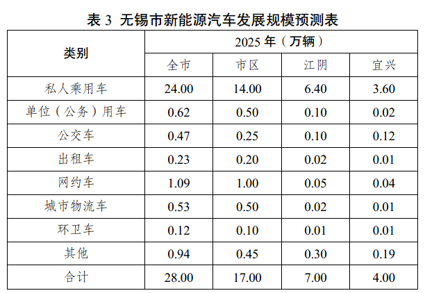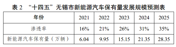 近年來無錫市機動車保有量進入穩定增長階段,預計十四五期間平均每年新增機動車約為20萬輛,根據滲透率推算,全市每年推廣應用新能源汽車將由2021年約3萬輛增加至2025年約7萬輛。到2025年,全市新能源汽車保有量將達到28萬輛左右,參照機動車保有量占比情況,市區約為17萬輛,江陰市約為7萬輛,宜興市約為4萬輛。