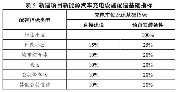3.嚴格充電設施配建標準。新建居住社區要確保固定車位100%建設充電設施或預留安裝條件。預留安裝條件時須將管線和橋架等供電設施建設到車位以滿足直接裝表接電需要。新建城市綜合體、公共停車場等預留不低于10%比例的新能源汽車充電停車位。為適應新能源汽車發展趨勢,滿足充電設施需求,新建項目直接建設充電車位比例以及預留安裝條件車位比例如下表: