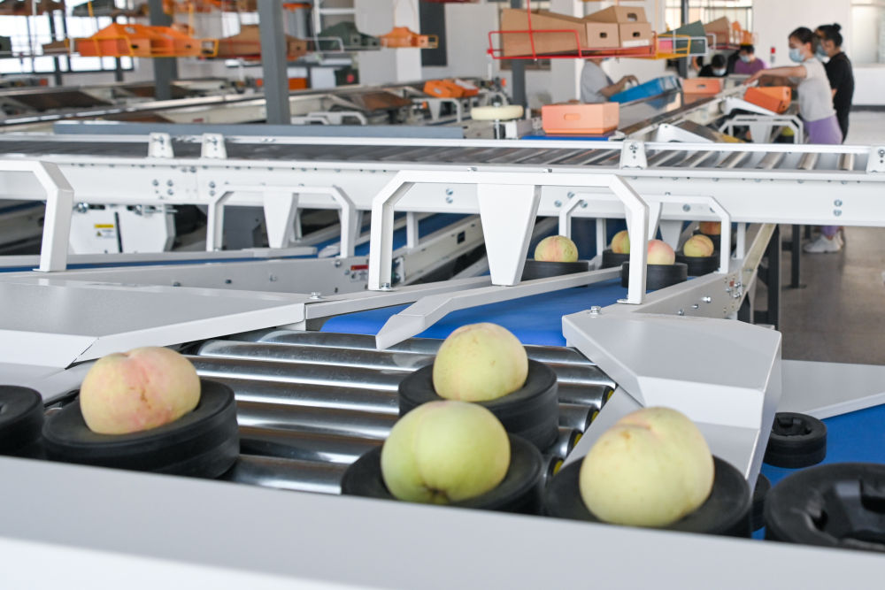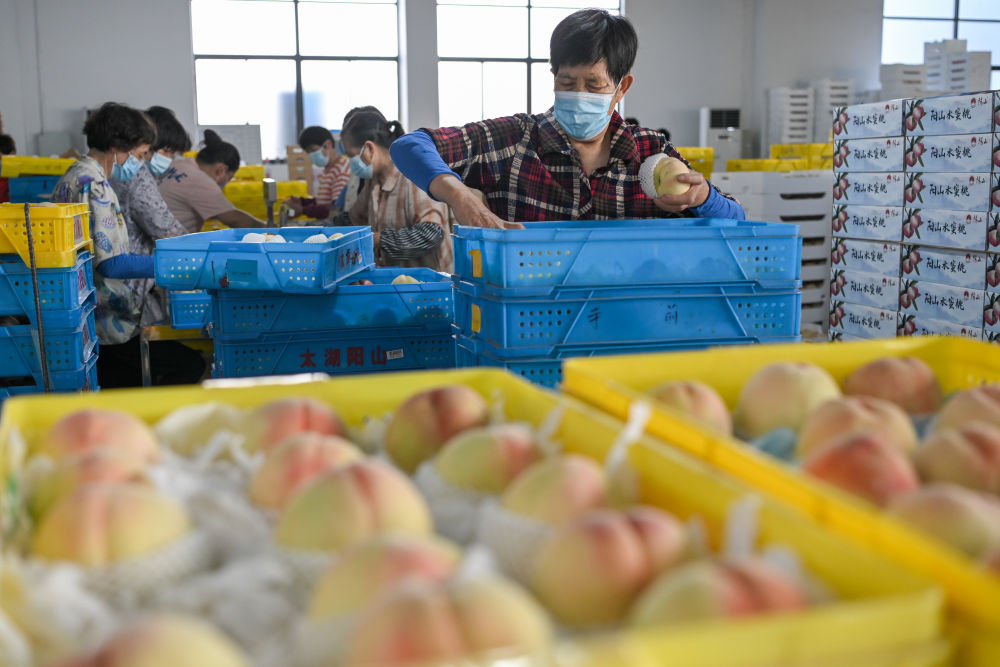 7月8日,工人在無錫太湖陽山水蜜桃科技有限公司內分裝水蜜桃。