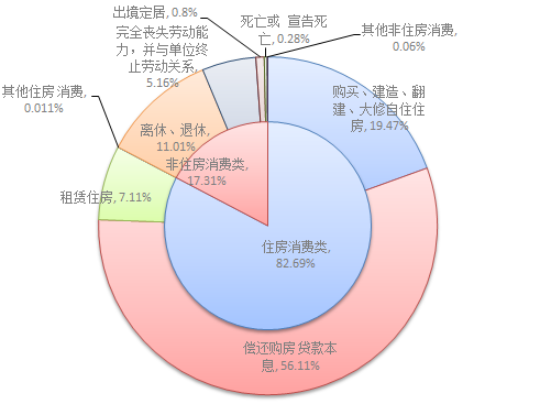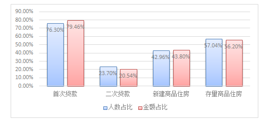從貸款群體來看,剛需與改善型住房需求職工分別占貸款總人數的36.68%和54.83%。從單位性質來看,以城鎮私營企業職工為主,貸款筆數和貸款金額占比分別為47.17%、46.28%。從購房面積來看,職工貸款購買小于90㎡、90-120㎡房屋居多,分別占貸款總人數的36.68%、31.71%。從主借人繳存基數來看,貸款主要以中、低收入職工為主,分別占貸款總人數的30.85%、67.41%。從貸款類型來看,純公積金貸款和組合貸款占比分別為47.43%、52.57%。從貸款結構來看,首次公積金貸款職工占貸款總人數的76.3%,第二次住房公積金貸款人數占23.7%。具體放貸結構如下: