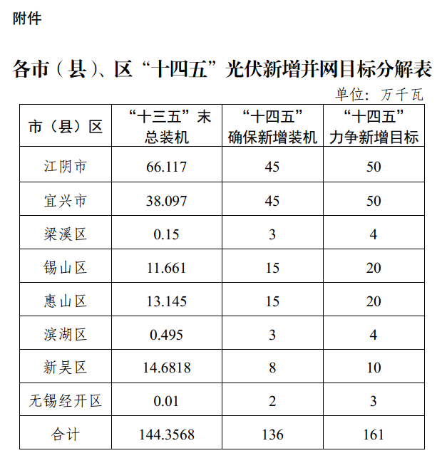 附件:各市(縣)、區十四五光伏新增并網目標分解表