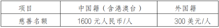 本次賽事馬拉松項目開放300個慈善名額,半程馬拉松項目開放200個慈善名額,報滿截止,選報慈善名額的運動員可直接獲得參賽資格。慈善名額2月17日開放報名通道,名額額滿即止,報名一經確認,不接受退款申請。慈善名額報名費如下: