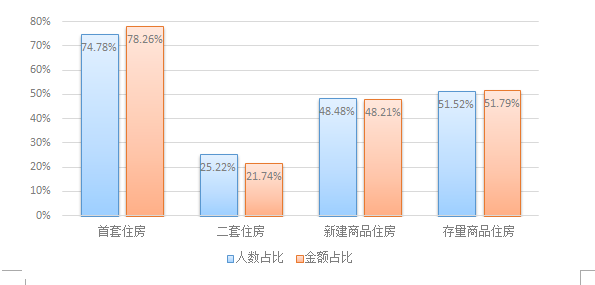 從貸款群體來看,剛需與改善型住房需求職工分別占貸款總人數的30.63%和61.88%。從單位性質來看,以其他城鎮企業職工為主,貸款筆數和貸款金額占比分別為49.11%、48.25%。從購房面積來看,職工貸款購買小于90㎡、90-120㎡房屋居多,分別占貸款總人數的30.63%、37.14%。從主借人繳存基數來看,貸款主要以中、低收入職工為主,分別占貸款總人數的29.25%、69.21%。從貸款類型來看,純公積金貸款和組合貸款占比分別為37.98%、62.02%。從貸款結構來看,首套住房公積金貸款職工占貸款總人數的74.78%,二套住房公積金貸款人數占25.22%。具體放貸結構如下: