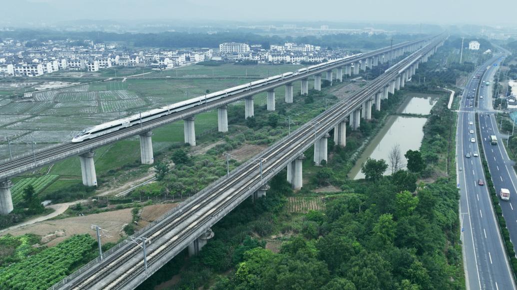 6月4日,從安徽省黃山市開往浙江省杭州市的列車從黃山北站駛出。近年來,安徽省黃山市和浙江省杭州市借助長三角一體化發展的東風,兩地在文旅領域保持緊密合作。 新華社 發(樊成柱 攝)