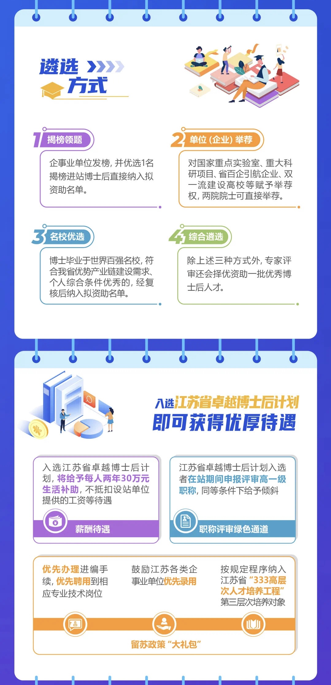 實(shí)施卓越博士后計(jì)劃,吸引集聚博士后開(kāi)展“卡脖子”技術(shù)攻關(guān),圍繞產(chǎn)業(yè)鏈布局人才鏈,培養(yǎng)造就一批進(jìn)入世界科技前沿的優(yōu)秀青年科技人才,是我省新時(shí)代人才強(qiáng)省建設(shè)的戰(zhàn)略舉措。據(jù)悉,對(duì)于每名入選者,省財(cái)政按兩年共30萬(wàn)元標(biāo)準(zhǔn),分年予以資助,資助經(jīng)費(fèi)主要用于入選者的生活補(bǔ)助,不抵扣設(shè)站單位提供的工資等待遇。除了真金白銀,還強(qiáng)化人才留蘇集成配套激勵(lì),明確入選者出站留蘇的,按規(guī)定程序納入江蘇省“333高層次人才培養(yǎng)工程”第三層次培養(yǎng)對(duì)象;入選者出站到事業(yè)單位工作的,優(yōu)先辦理進(jìn)編手續(xù),優(yōu)先聘用到相應(yīng)專(zhuān)業(yè)技術(shù)崗位。