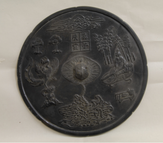 無錫博物院藏“真子飛霜”鏡鈕的最上方繪有一片祥云,月亮正從云中慢慢升起,在云海下方有一田字格,格中“真子飛霜”四字。圖案下方為一潭水波蕩漾的蓮花池,池中徐徐升起一片荷葉,上面還托起一只烏龜,荷葉作銅鏡的鈕座,烏龜作鏡鈕,構(gòu)思巧妙而自然。在鏡鈕的右側(cè)有一頭戴華冠、褒衣博帶、端坐撫琴的高士,在他的身后是一片茂密的竹林和新生春筍,高士面前置有一張長條幾案,上面擺著書卷、硯臺、香爐,清雅閑適。與高士相對的左側(cè),有一只振翅欲飛、翹首顧盼的鳳凰立于山石之上。
