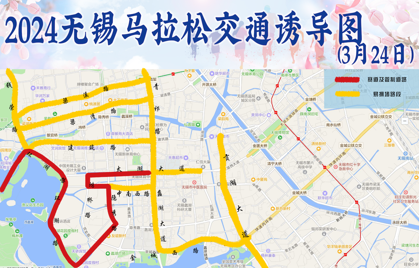 為保證賽事順利進行,比賽當天部分道路實施臨時交通管制。“周日也是踏青出游的高峰,山水西路、山水東路沿線路口在比賽期間臨時管制,建議市民錯峰出行。”市交警支隊勤務科盛曉丹表示,今年的賽事保障將更具人性化。例如,江南大學是錫馬的途經點,該點位毗鄰江大附院。根據往年賽事經驗發現,開機動車、坐地鐵的市民都有穿行路線,但騎電動車的市民容易被“卡”在吳都路。為此,公安部門在蠡湖快速路和吳都路立交下的快速通道處,開辟了一條通道,方便非機動車去醫院。此外,公安部門聯手辦賽方設置了多個車輛穿越點,最大限度減少對市民出行的影響。“市民在不影響賽事安全的情況下,由沿線執勤警力指揮穿行。”此外,海岸城處行人較多,公安部門也設置了人群穿越點。現場將有志愿者配合現場警力,形成人群安全島幫助市民穿越。