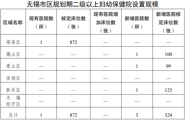 市區已設置三級公立婦幼保健醫院1所(無錫市婦幼保健院)。到“十四五”期末,市區新設置二級公立婦幼保健院3所(錫山區、惠山區、新吳區各舉辦1所)。