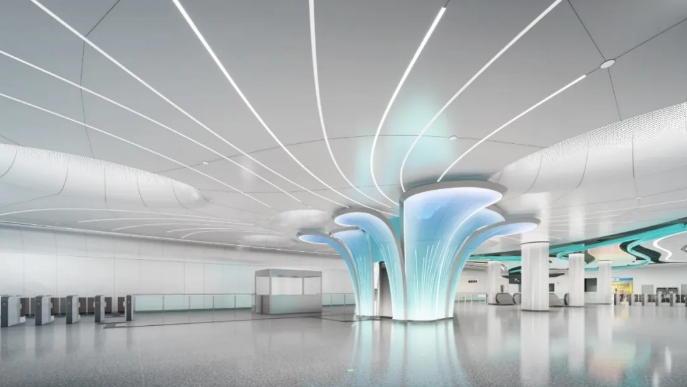 地鐵4號線二期無錫新區站,首次采用的大空間無柱設計是車站裝飾裝修最明顯的標志。
