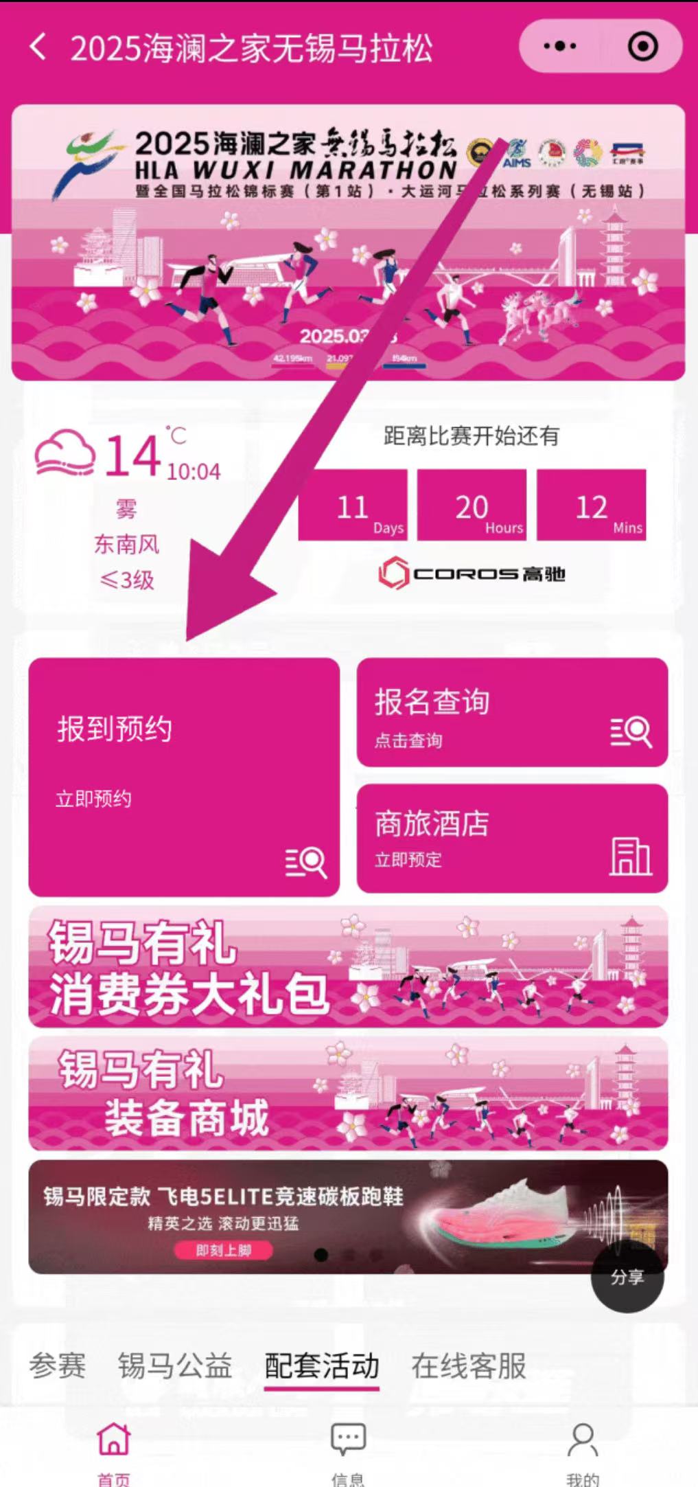 1. 先預約,后報到。未預約到場將無法領取參賽物品;2. 參賽選手須在錫馬「參賽助手」小程序預約報到時段。
