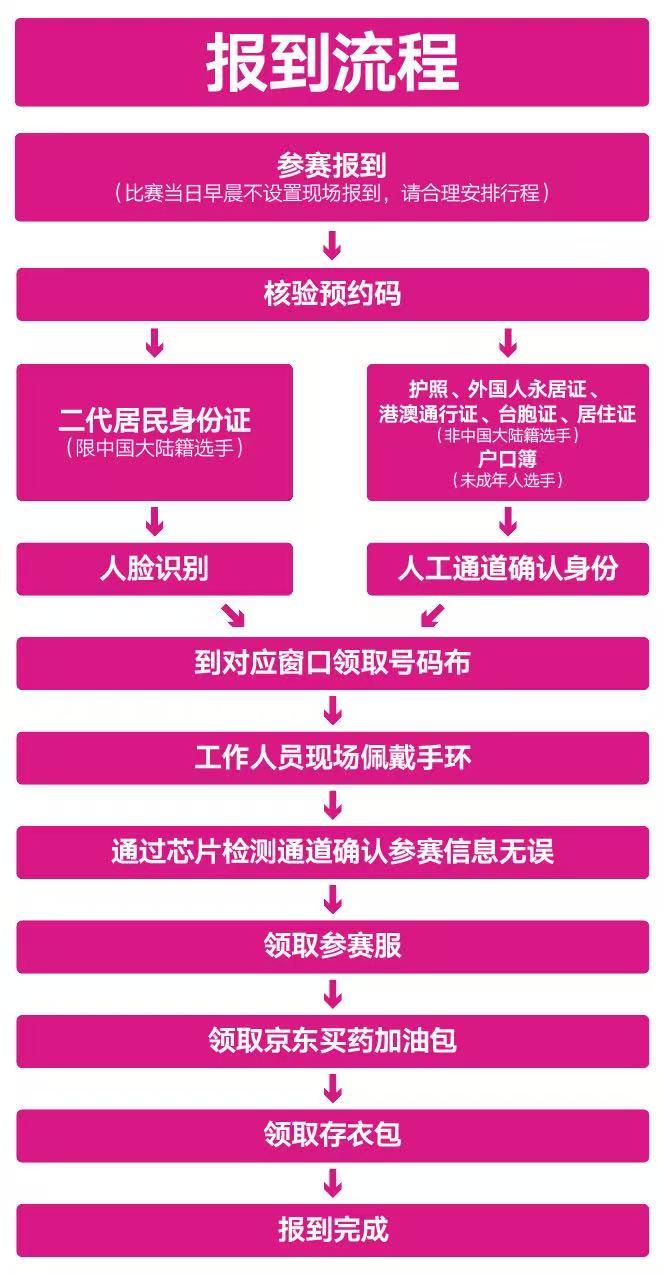 1. 中國大陸籍選手須持二代居民身份證原件;2. 中國香港、中國澳門籍選手須持港澳居民來往內地通行證或港澳居民居住證原件;3. 中國臺灣籍選手須持臺灣居民來往大陸通行證或臺灣居民居住證原件;4. 外籍選手須持護照或外國人永久居留身份證原件;5. 18周歲以下未成年選手,須由其監護人或者法定代理人持監護人證件原件、身份證或戶口簿原件,攜選手本人辦理報到手續。*請確保所持證件在有效期內,并與報名填報信息一致。無上述證件原件者,將拒絕為其發放參賽物品。