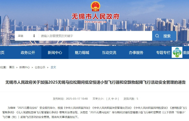 無錫市人民政府關于加強2025無錫馬拉松期間低空慢速小型飛行器和空飄物起降飛行活動安全管理的通告