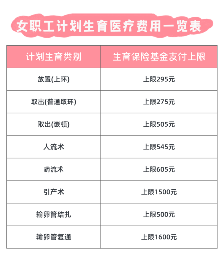 (3)計(jì)劃生育醫(yī)療費(fèi):女職工實(shí)施放置或者取出宮內(nèi)節(jié)育器、人工流產(chǎn)術(shù)或者引產(chǎn)術(shù)、輸卵管結(jié)扎以及復(fù)通手術(shù)等,所發(fā)生的符合生育保險(xiǎn)規(guī)定的醫(yī)療費(fèi)用,以及在手術(shù)和住院期間,因?qū)嵤┯?jì)劃生育手術(shù)引起的并發(fā)癥的醫(yī)療費(fèi)用。