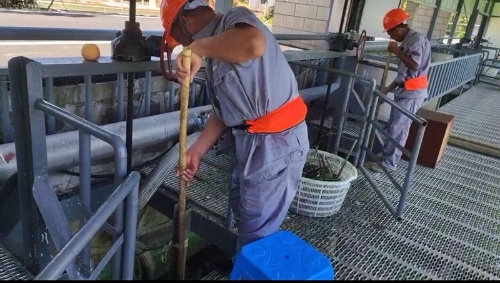 采訪中,記者看到,雖然7日湖面風力在4級以上、氣溫在40攝氏度以上,但藍藻打撈點的工人們仍堅守崗位。在茭瀆港南藍藻打撈點,杭訓良剛結束平臺外部的垃圾打撈,在平臺內凳子上小憩。“我這主要是負責清除平臺內部、外部樹枝等垃圾,否則垃圾會流入渦輪吸藻井,導致設備無法工作。”他說。耐熱是他們“必備”技能,因為這兩天一到下午溫度升高,平臺鋼制柵欄就燙手,一不小心手就會被燙一下,身上的衣服一天干了濕、濕了干至少3次。他們每隔一段時間就輪換下來,到平臺電風扇前吹吹風、喝口水。而在太湖七里堤藍藻打撈點,打撈人員黃小弟戴著帽子站在大太陽下用推流槍將水流射至岸邊蘆葦蕩前,防止藻水進入后出不來、受高溫影響而發白發臭。“我和同事每20分鐘就換班一次,這樣能緩緩。”他憨厚地笑著說。打撈點給他們配備了鹽汽水等補充大量流汗后的鹽分、水分,以及人丹等防暑降溫藥品。他覺得太陽下曬沒關系,“因為政府治理太湖的力度一年比一年大,夏天高溫天太湖水仍是清的”,水環境好了,他也經常邀請親朋好友來做客。