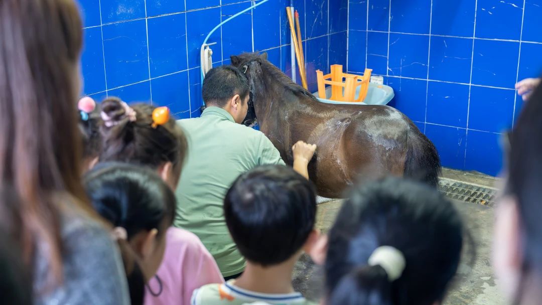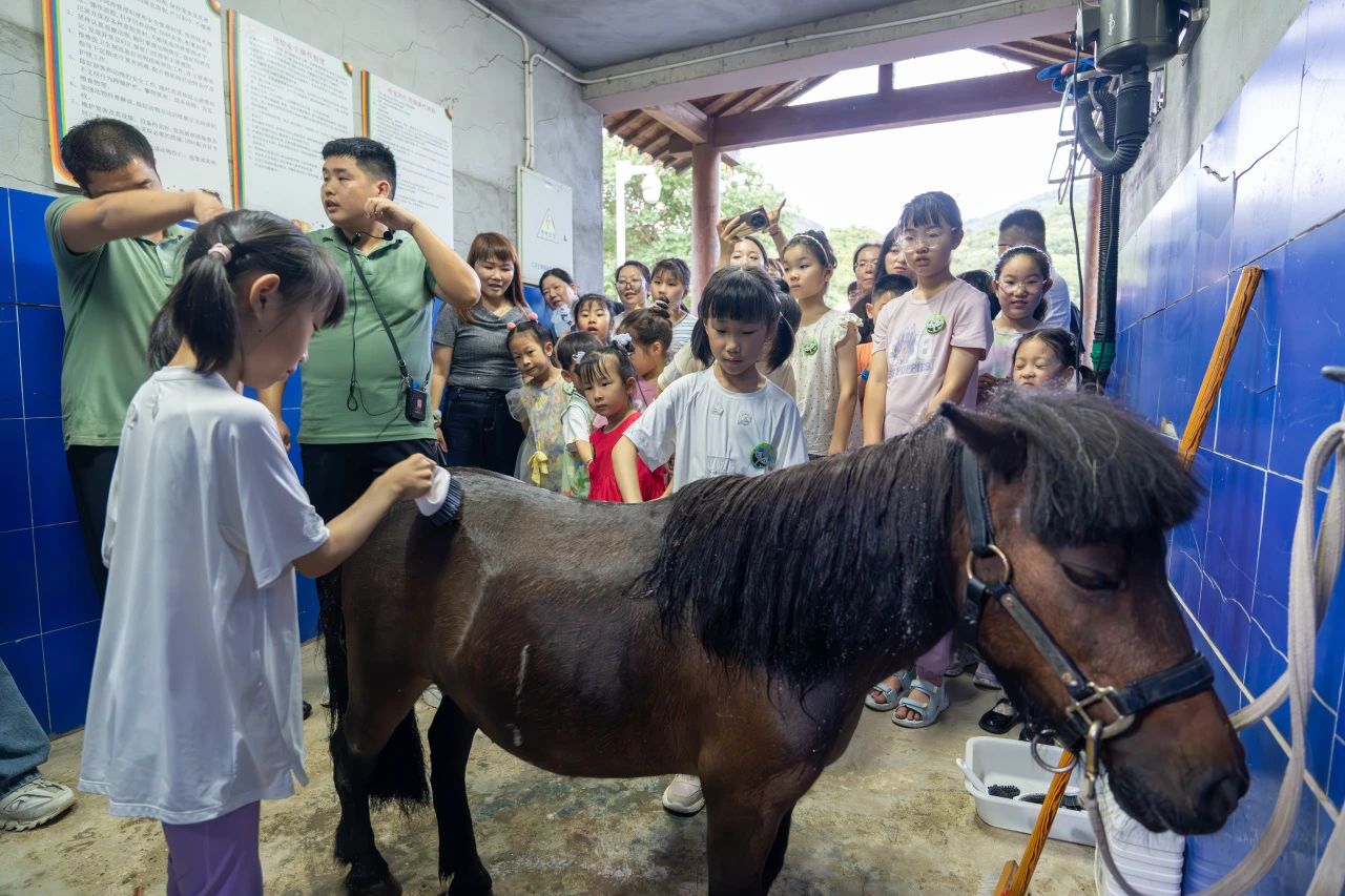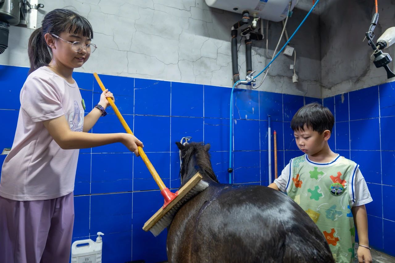 在保育員指導下為矮馬沖涼、刷背,