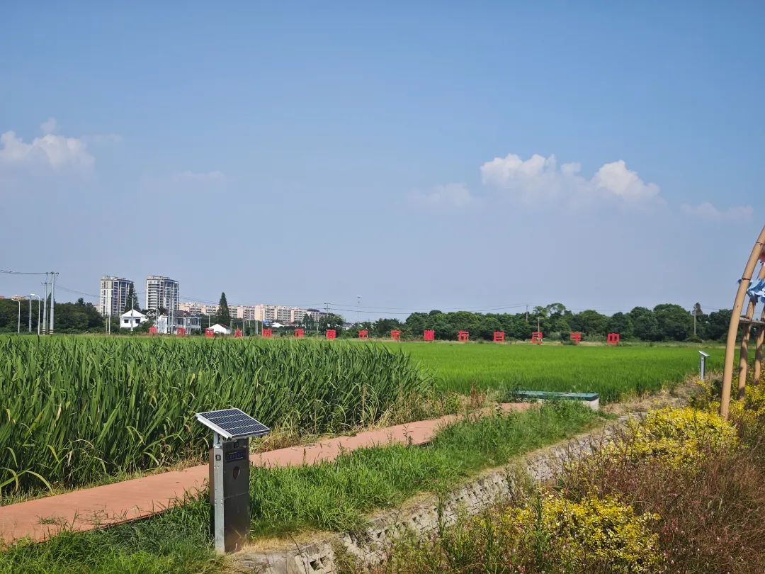 離開昊天種業,代表們來到長涇鎮蒲市村。在蒲市大米智慧農田示范區,連片的稻田里看不到忙碌的農人,取而代之的是分布在田間的傳感器和攝像頭。