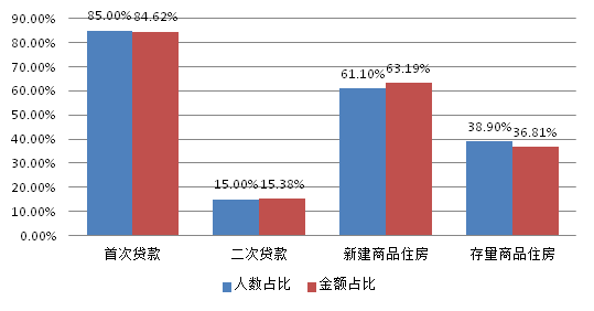 從貸款群體來看,剛需與改善型住房需求職工分別占貸款總人數的31.76%和61.36%。從單位性質來看,以城鎮私營企業及其他城鎮企業職工為主,貸款筆數和貸款金額占比分別為48.12%、46.05%。從購房面積來看,職工貸款購買小于90㎡、90-120㎡房屋居多,分別占貸款總人數的31.76%、37.24%。從主借人繳存基數來看,貸款主要以中、低收入職工為主,分別占貸款總人數的30.78%、67.04%。從貸款類型來看,純公積金貸款和組合貸款占比分別為51.07%、48.93%。從貸款結構來看,首次公積金貸款職工占貸款總人數的85%,第二次住房公積金貸款人數占15%,說明我市住房公積金貸款政策在保障剛需職工需求,體現住房公積金互助性方面發揮了較大的作用,住房公積金制度的初衷未改變。具體放貸結構如下: