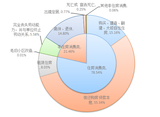 2023年三季度,住房消費(fèi)類提取金額為46.89億元,環(huán)比下降7.46%,占三季度提取額的78.54%。其中還貸提取占比最高,提取金額33.04億元,占三季度提取額的55.34%。具體提取結(jié)構(gòu)如下: